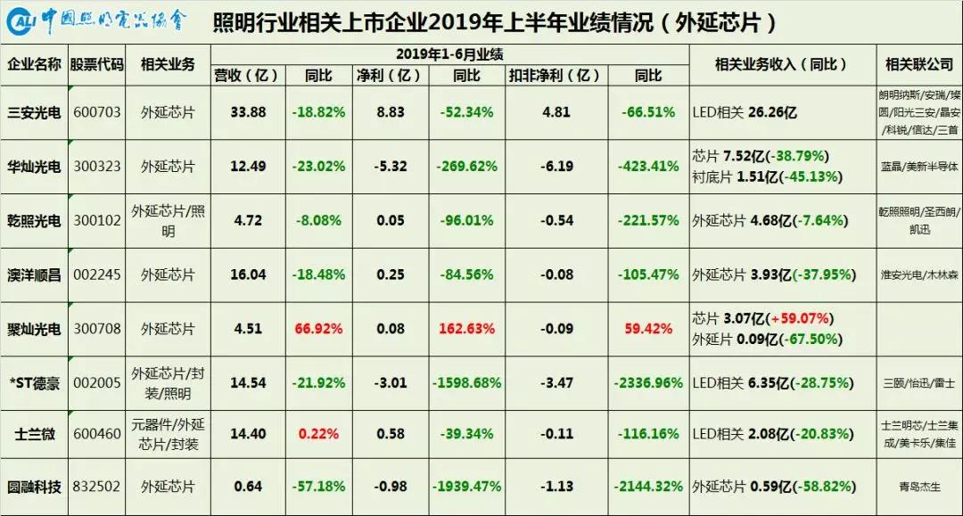 這(zhè)也就(jiù)造成(chéng)了2018年同期上遊各主要外延芯片廠商的業績指标尚處于增速減緩的形勢,而到了2019年上半年,其幾乎都(dōu)出現了營收和利潤大幅下滑以及庫存居高不下的狀況。