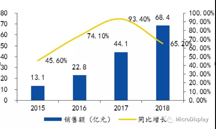 奧維雲網(AVC)數據顯示:2018年全年商用顯示市場整體規模達766.4億,同比增長(cháng)率達39.1%,其中小間距及miniLED市場規模貢獻68.4億。