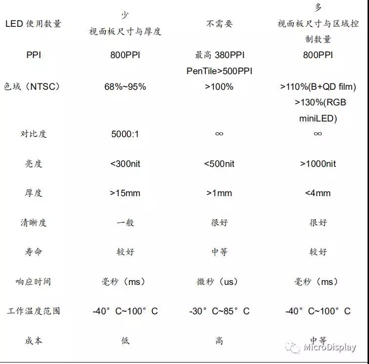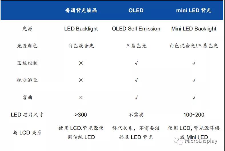 表3:普通液晶、OLED、miniLED+LCD背光顯示特性對(duì)比
