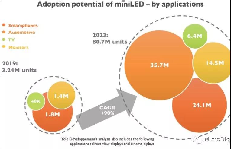 根據TrendForceLED研究預估,至2023年MiniLED背光産值將(jiāng)達3.4億美元(僅MiniLED背光産值,不含其他驅動IC與背闆)。