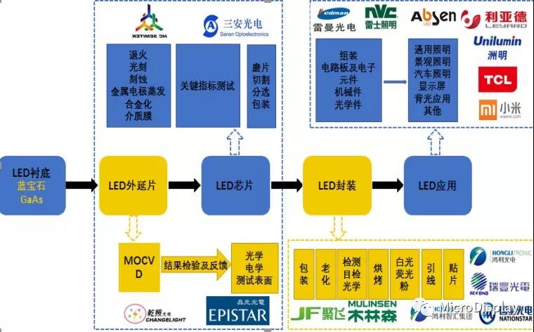 上遊襯底是生産外延片的主要原材料,當前襯底材料主要爲藍寶石及GaAs。外延環節是在襯底上通過(guò)MOCVD形成(chéng)半導體發(fā)光材料薄膜從而制成(chéng)外延片的過(guò)程。芯片制造環節則是通過(guò)一系列半導體工藝將(jiāng)外延片制備成(chéng)發(fā)光顆粒,并通過(guò)關鍵指标測試,再進(jìn)行磨片、切割、分選和包裝。中遊封裝是指將(jiāng)外引線連接至芯片電極,形成(chéng)LED器件的環節。封裝的主要作用在于保護芯片與提高光提取效率。下遊應用是針對(duì)各類市場需求制成(chéng)面(miàn)向(xiàng)終端用戶的應用産品。如通用照明、景觀照明、汽車照明、顯示屏、背光應用等。目前,照明是終端市場應用最廣泛的産品,其次是顯示屏及背光應用。值得注意的是:盡管國(guó)内LED照明市場趨于成(chéng)熟,下遊需求增速已經(jīng)開(kāi)始放緩,而以小間距及miniLED爲代表的新型顯示及背光市場仍呈現快速增長(cháng)态勢。