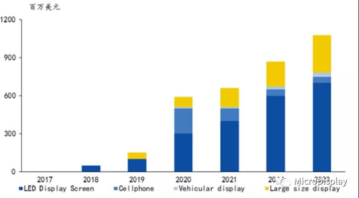 miniLED作爲一種(zhǒng)市場前景廣闊的新技術,具有“薄膜化,微小化,陣列化”的優勢,將(jiāng)逐步導入産業應用。從終端應用場景來分,miniLED的應用領域可以分爲直接顯示和背光兩(liǎng)大場景。受益于兩(liǎng)大場景的雙重驅動,MiniLED市場規模有望迎來快速成(chéng)長(cháng),據LEDinside預測,2023年整體MiniLED産值將(jiāng)超過(guò)10億美元。
