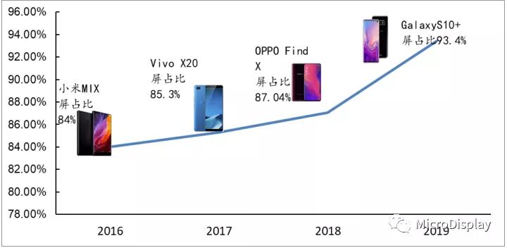 全面(miàn)屏——手機顯示技術的重要趨勢。2016年10月小米發(fā)布MIX概念款手機,全面(miàn)屏開(kāi)始在國(guó)内市場得到預熱;2017年各大一線手機品牌幾乎均踏過(guò)80%屏占比門檻;2018年,升降式攝像頭、劉海屏、AAHole等高屏占比技術路線百花齊放。