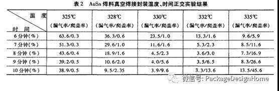 一般卧式真空爐的真空焊接封裝工藝從加熱底開(kāi)始到加熱結束大約爲7.5分鍾到9分鍾之間,具體時(shí)間主要取決于電路及焊料環大小,當然,不同類型的設備會(huì)有略微差異。我們分别對(duì)真空焊接封裝溫度325℃一335℃、焊接時(shí)間6—10分鍾的情況做了分組正交實驗,并就(jiù)同一種(zhǒng)底座、焊料環和蓋闆在焊接封裝後(hòu)對(duì)其漏氣率和焊料爬蓋率進(jìn)行了統計,具體結果如表2。
