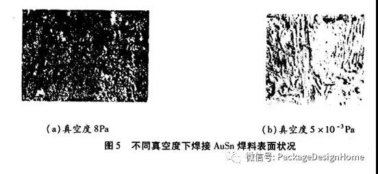 爲了較好(hǎo)地體現出實驗的可比性,實驗采取了分别在一種(zhǒng)較差的真空度(8Pa)下和一種(zhǒng)較好(hǎo)的真空度(5X10-3Pa)下進(jìn)行AuSn焊料的焊接封裝。實驗結果見圖5。由圖可以看出,在8Pa下進(jìn)行焊接的AuSn焊料明顯嚴重氧化發(fā)黑,這(zhè)將(jiāng)嚴重影響焊接封裝質量;而在5×10-3Pa下進(jìn)行焊接的AuSn焊料除了由于表面(miàn)雜質而存在個别缺陷外幾乎沒(méi)有氧化,焊接封裝質量較好(hǎo),成(chéng)品率較高。