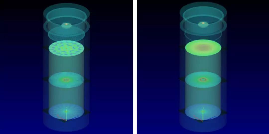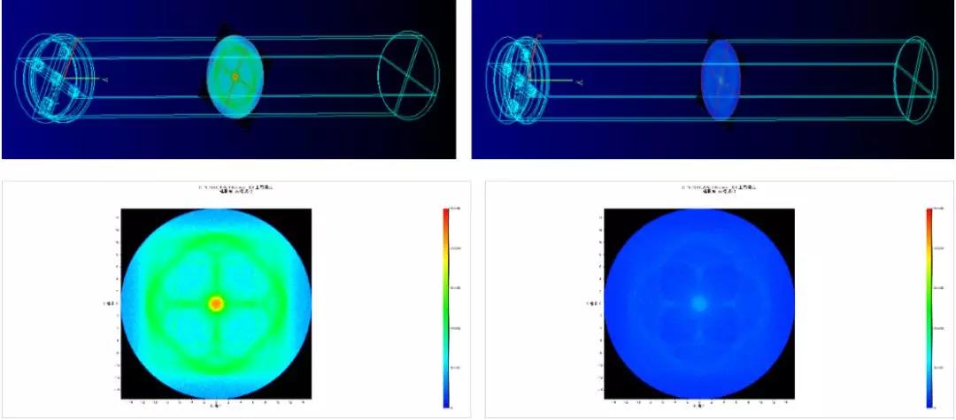 内壁反射對(duì)比實驗的模型及光分布圖(左爲聚四氟乙烯,右爲不鏽鋼)