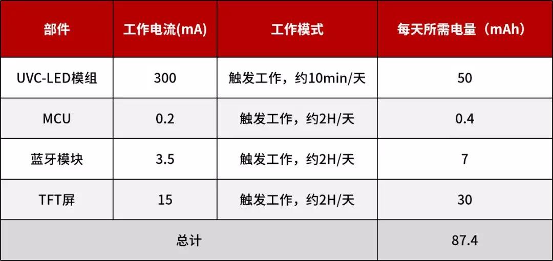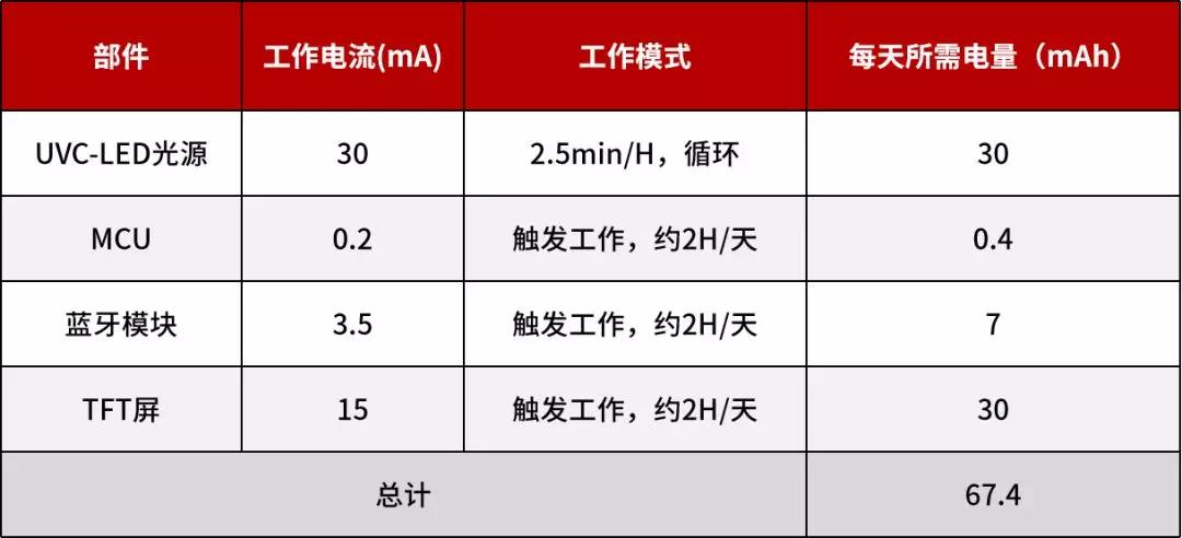 整個模組使用一顆輻射功率2mw的UVC-LED光源,工作模式爲循環工作,每小時(shí)點亮2.5min。針對(duì)300ml容積的水杯(滿水),實測可實現長(cháng)效抑菌效果。搭載藍牙以及顯示模塊後(hòu),整個模組的耗電情況如下表: