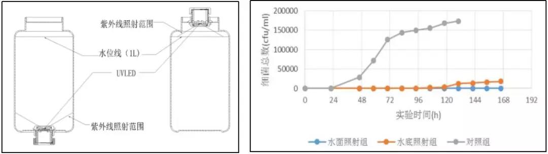 對(duì)于潔淨水的抑菌應用,在UVC輻射功率、容器形狀、水量均相同且光照無遮擋的情況下,光源從水面(miàn)照射的抑菌效果要好(hǎo)于水底照射。原因是潔淨水的細菌來源是空氣和水的接觸面(miàn),也就(jiù)是水位線。水面(miàn)照射的方式離“防線”更近,輻射強度更高,抑菌效果更好(hǎo)。