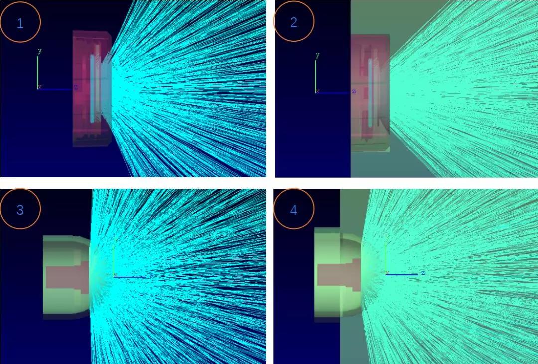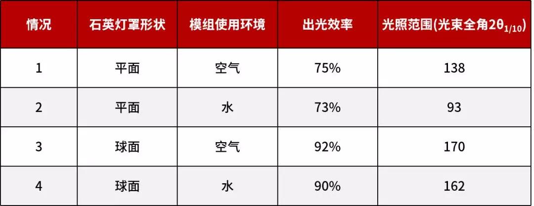 目前市面(miàn)常見的UVC-LED光源模組,石英燈罩形狀分爲平面(miàn)與球面(miàn)兩(liǎng)種(zhǒng),模組的使用環境分爲水上與水中兩(liǎng)種(zhǒng)。下表以一顆3535封裝,近朗伯光型的UVC-LED爲例,對(duì)比在不同情況下的出光情況: