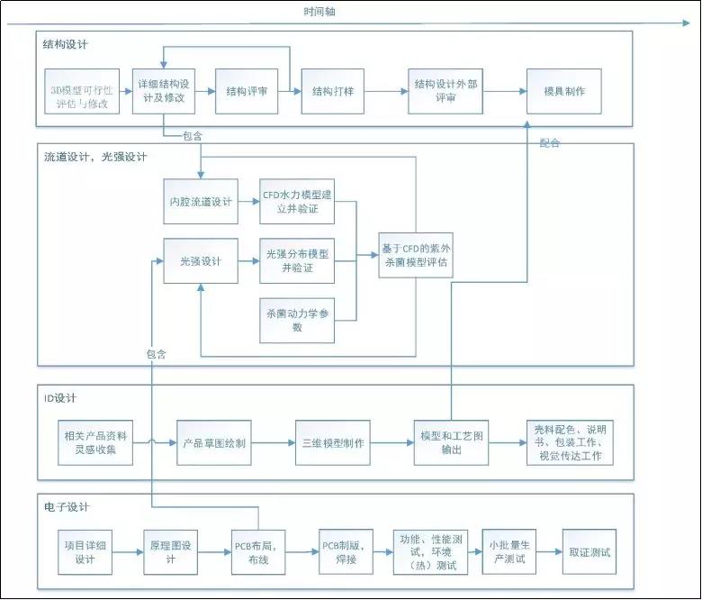 下圖是UVC-LED應用産品研發(fā)流程的一部分,仿真設計貫穿于産品設計過(guò)程中,與結構、ID、電子設計是緊密聯系的并行關系。