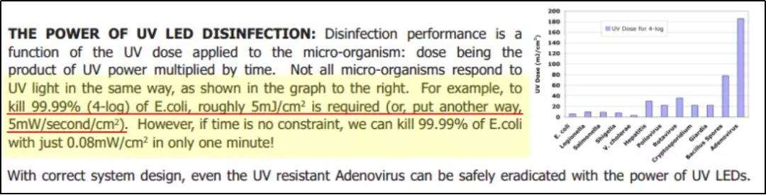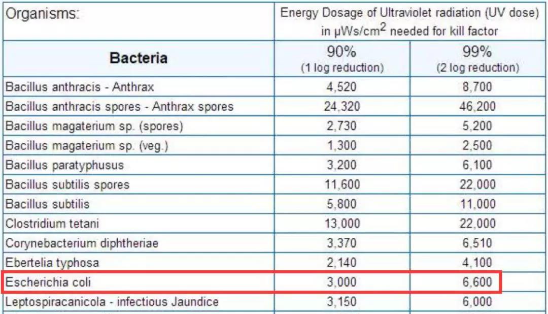下面(miàn)以大腸杆菌(E.coli)爲例,使用UVC燈管達到99%的滅殺率需要的UV劑量爲6.6mJ/cm2,使用UVC-LED要高效一些,達到99.99%的滅殺率兩(liǎng)家同行給出的UV劑量分别約爲3mJ/cm2與5mJ/cm2。