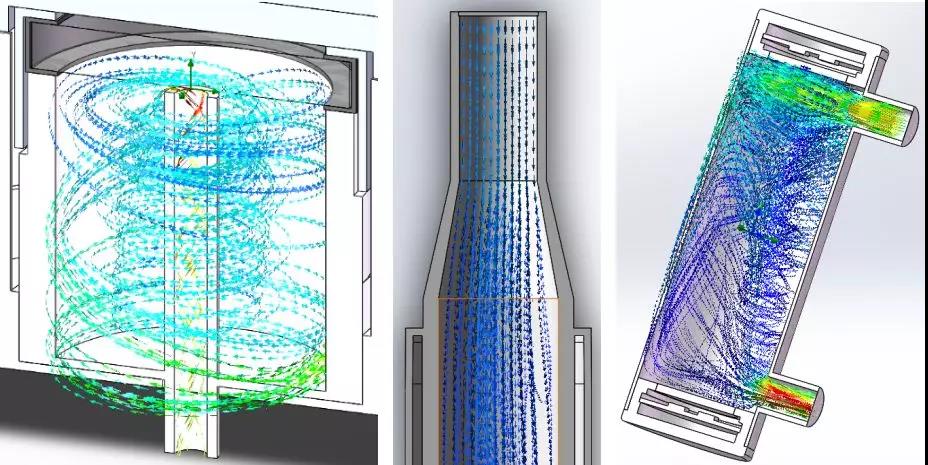 然而光憑一個内部結構和肉眼觀察,我們一無所知。這(zhè)時(shí)候一個定性的模拟仿真就(jiù)能(néng)幫到我們。例如下面(miàn)三張圖沒(méi)有任何的數據,我們依然能(néng)直觀的看出設計的優劣:左圖利用規則的旋流增加水體的照射時(shí)間,中圖利用低雷諾數結構避免出現短流,右圖雜亂無章的流線表明其流體設計不佳,還(hái)有很大的改進(jìn)空間。