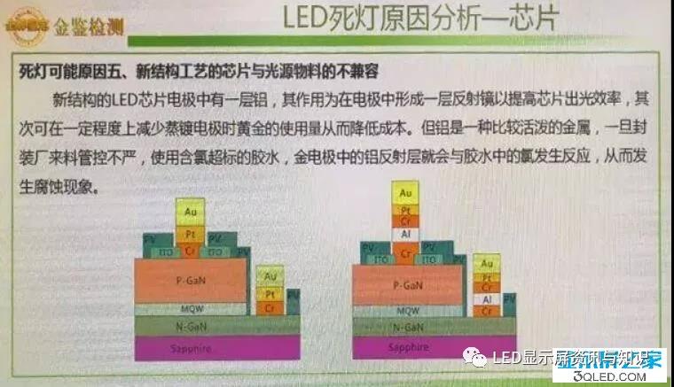 新結構的LED芯片電極中有一層鋁,其作用爲在電極中形成(chéng)一層反射鏡以提高芯片出光效率,其次可在一定程度上減少蒸鍍電極時(shí)黃金的使用量從而降低成(chéng)本。但鋁是一種(zhǒng)比較活潑的金屬,一旦封裝廠來料管控不嚴,使用含氯超标的膠水,金電極中的鋁反射層就(jiù)會(huì)與膠水中的氯發(fā)生反應,從而發(fā)生腐蝕現象。
