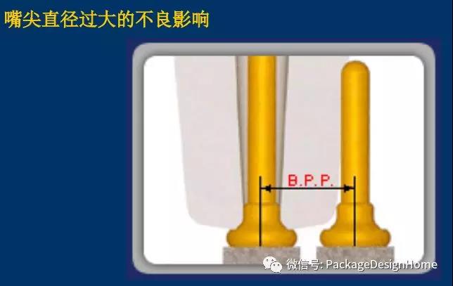 嘴尖直徑過(guò)大,并且超過(guò)min B.P.P,會(huì)造成(chéng)瓷嘴碰到鄰近的金線。