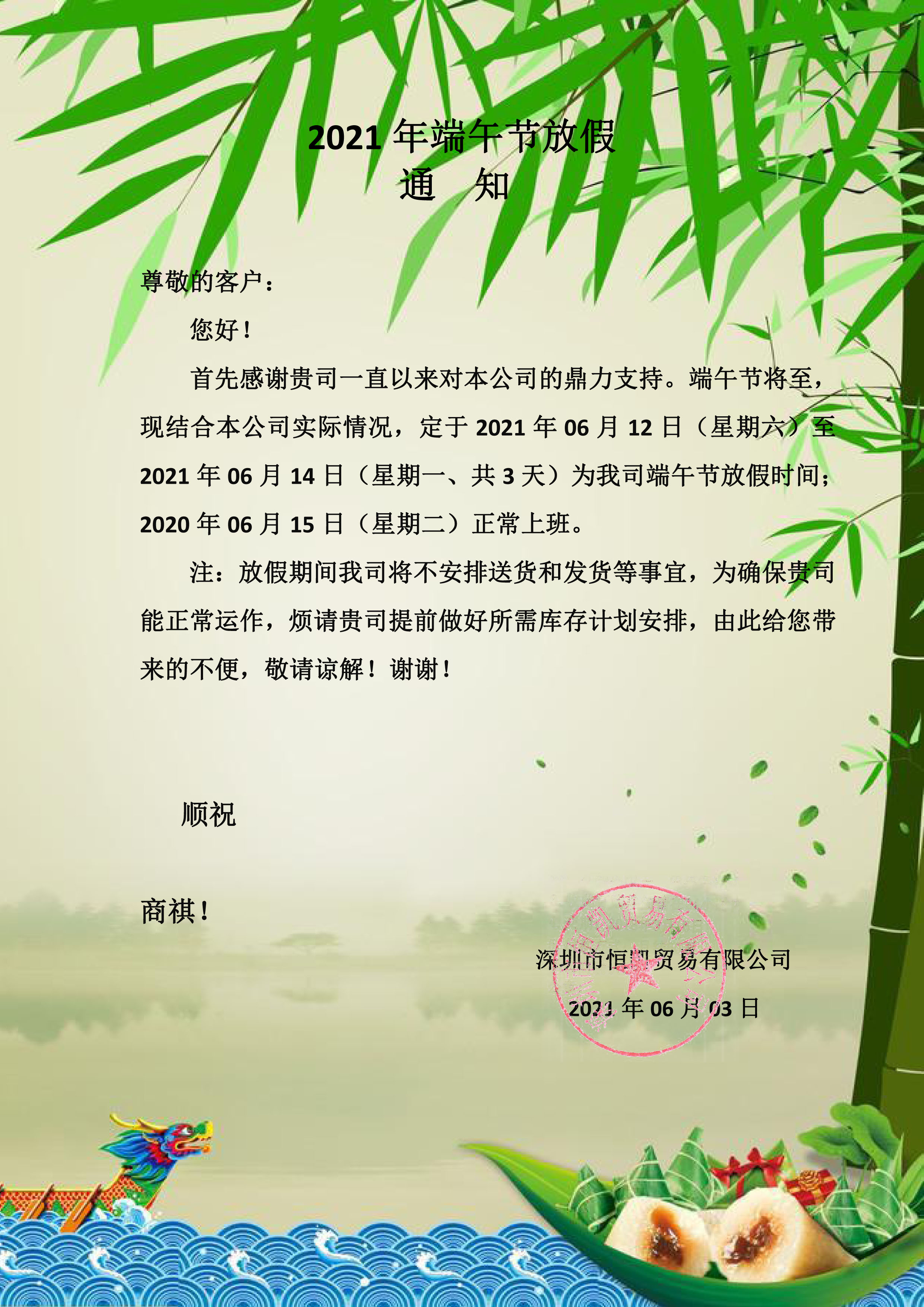 首先感謝貴司一直以來對(duì)本公司的鼎力支持。端午節將(jiāng)至,現結合本公司實際情況,定于2021年06月12日(星期六)至2021年06月14日(星期一、共3天)爲我司端午節放假時(shí)間;2020年06月15日(星期二)正常上班。